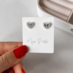 Brinco cadeado coração borda cravejada 10mm | Mya Prata