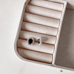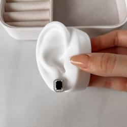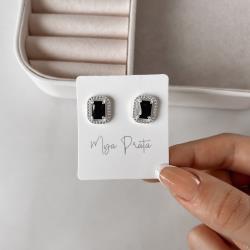 Brinco zircônia retangular ônix com cravejado 13mm | Mya Prata