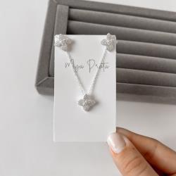 Conjunto brinco e colar flor cravejada 15mm corrente cadeado 40+5cm | Mya Prata