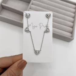 Conjunto brinco e colar entremeio corações vazados cravejados 9mm ródio 40+5cm | Mya Prata