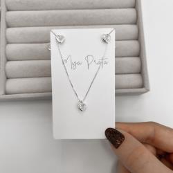 Conjunto brinco e colar zircônia coração embutida 6mm 40cm | Mya Prata
