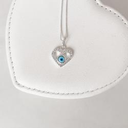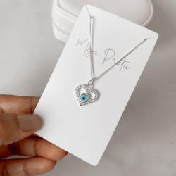 Colar pingente coração vazado cravejado com olho grego madrepérola 15mm 45cm | Mya Prata