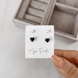 Dupla zircônias coração cristal 4mm e ônix 6mm | Mya Prata