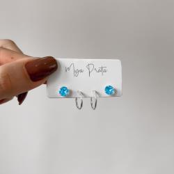 Dupla zircônia redonda azul 6mm e argola 12mm | Mya Prata