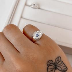 Descrição: Anel olho cravejado detalhe zircônias azul dedinho fabricado(a) em prata
