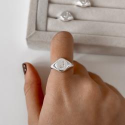 Descrição: Anel oval letra J cravejada regulável P fabricado(a) em prata