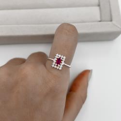 Descrição: Anel zircônia retangular rubi com cravejado fabricado(a) em prata