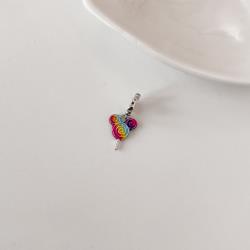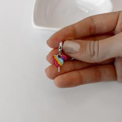 Descrição: Berloque pingente pirulito Mickey resina 16mm elo cravejado envelhecido fabricado(a) em prata