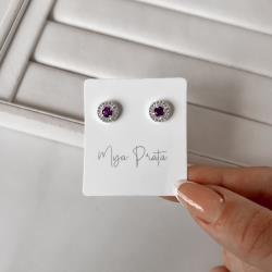 Descrição: Brinco zircônia redonda ametista com cravejado 9mm fabricado(a) em prata
