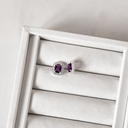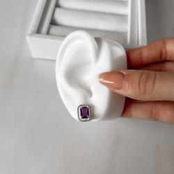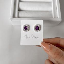 Brinco zircônia retangular ametista com cravejado 13mm | Mya Prata