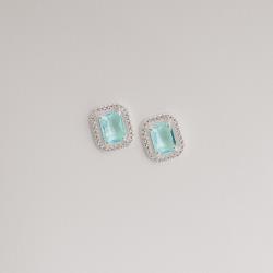 Brinco zircônia retangular azul claro com cravejado 13mm | Mya Prata