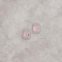 Brinco zircônia retangular rosa com cravejado 13mm | Mya Prata