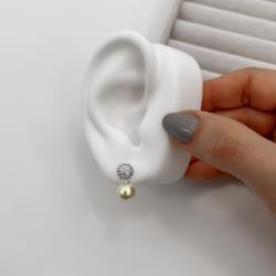 Descrição: Brinco meia bola cravejada e pérola 17mm fabricado(a) em prata
