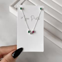 Conjunto brinco e colar zircônias coloridas 4mm 45+5cm