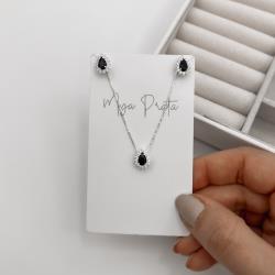 Conjunto brinco e colar zircônia gota ônix com cravejado 10mm 45cm | Mya Prata