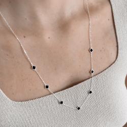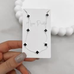 Colar entremeio trevos pedra ônix 6mm corrente cadeado 60+5cm | Mya Prata