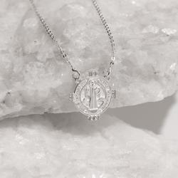 Colar medalha São Bento com zircônias 17mm corrente cadeado 40cm com alongadora | Mya Prata