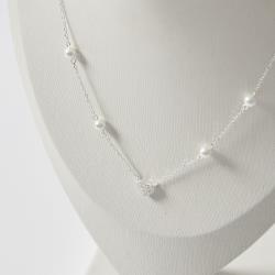 Descrição: Colar entremeio coração cravejado e pérolas 5mm corrente cadeado 40+5cm fabricado(a) em prata