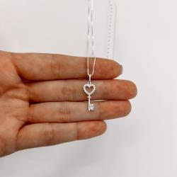 Descrição: Colar pingente chave coração vazado cravejado 19mm 45cm fabricado(a) em prata