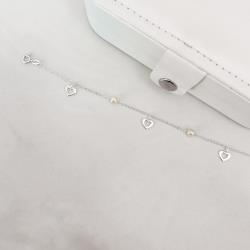 Descrição: Pulseira entremeio pérola com pingentes coração vazado fabricado(a) em prata