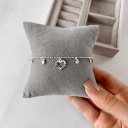 Descrição: Pulseira pingentes coração vazado e mini corações com vinco fabricado(a) em prata